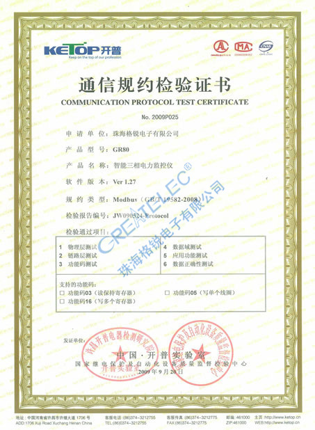 GR80通信规约检验证书