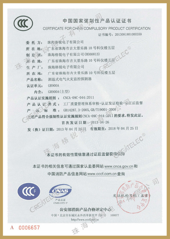 当前位置: 公司资质 型式检验报告/3C证书 > 电气火灾3C证书