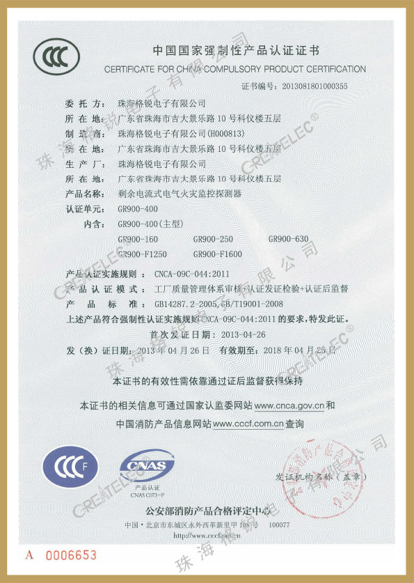 当前位置: 公司资质 型式检验报告/3C证书 > 电气火灾3C证书